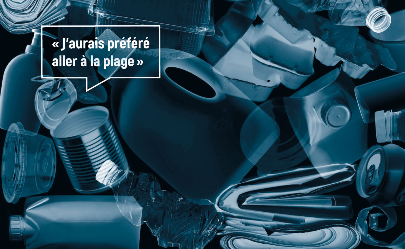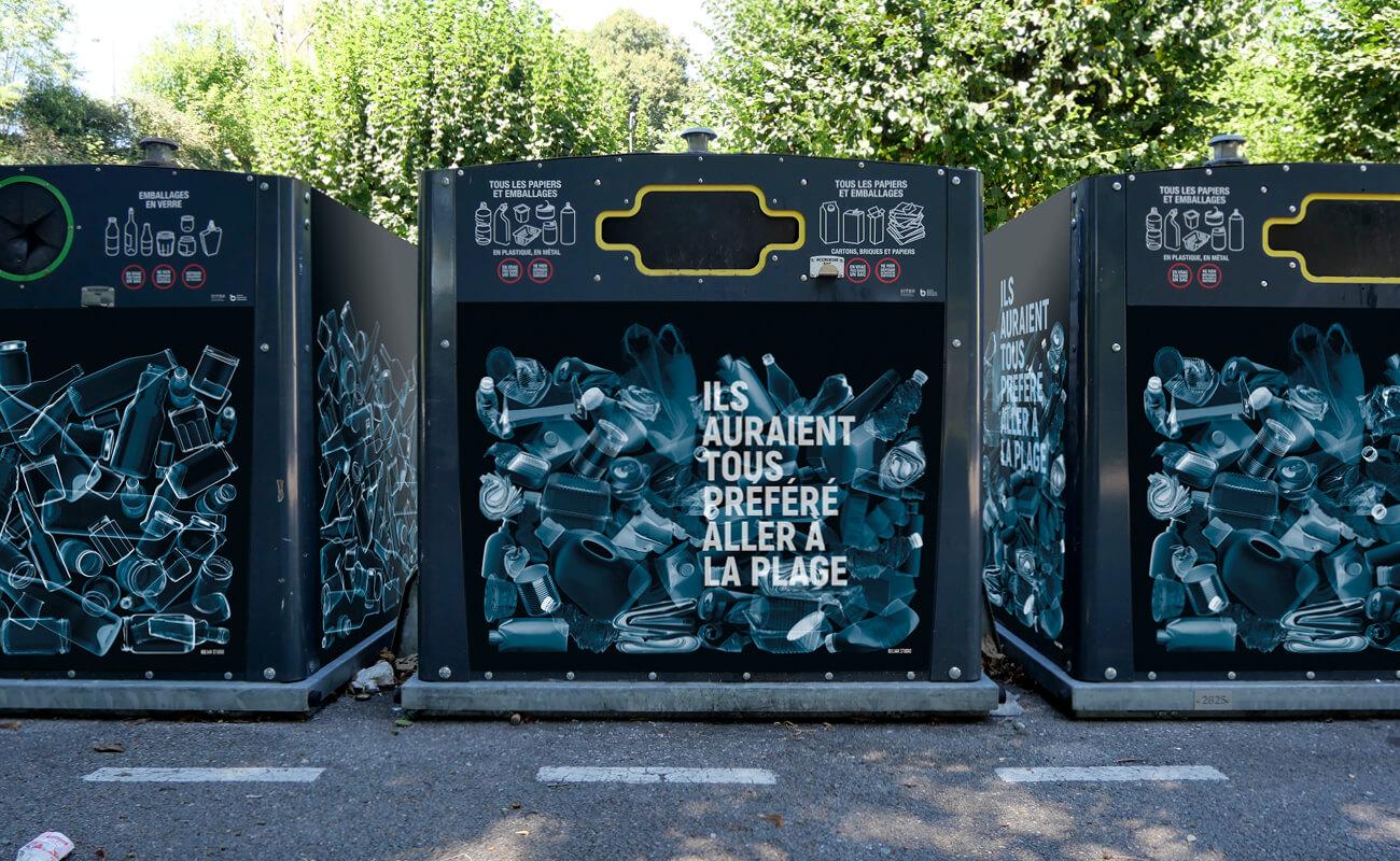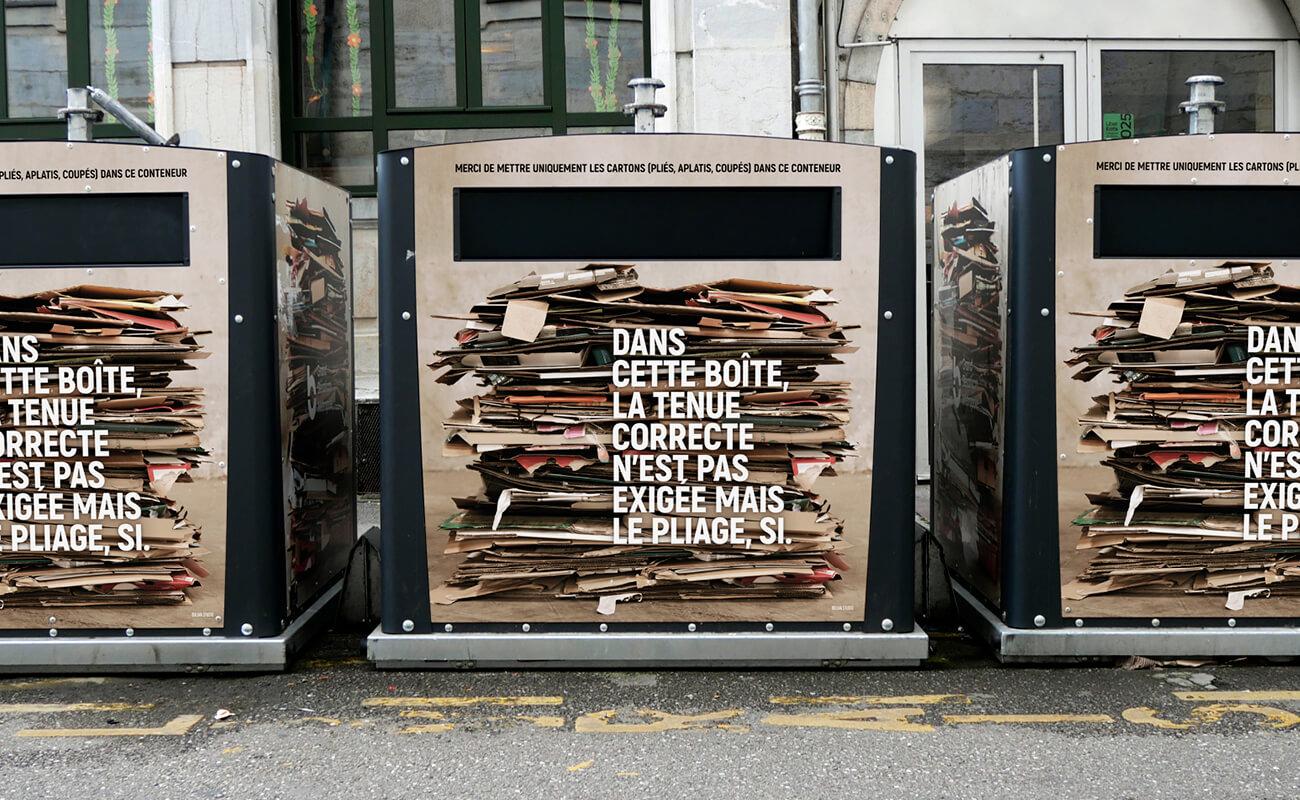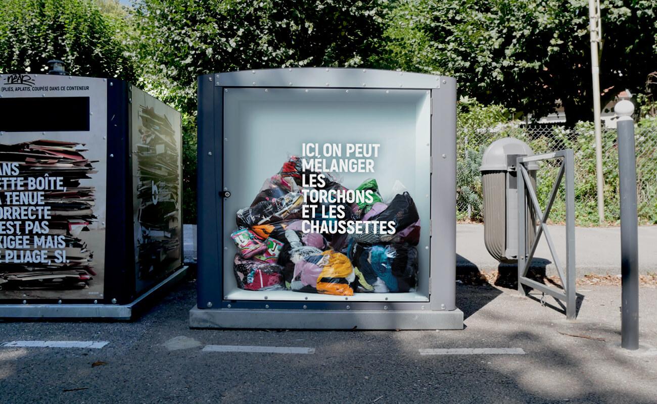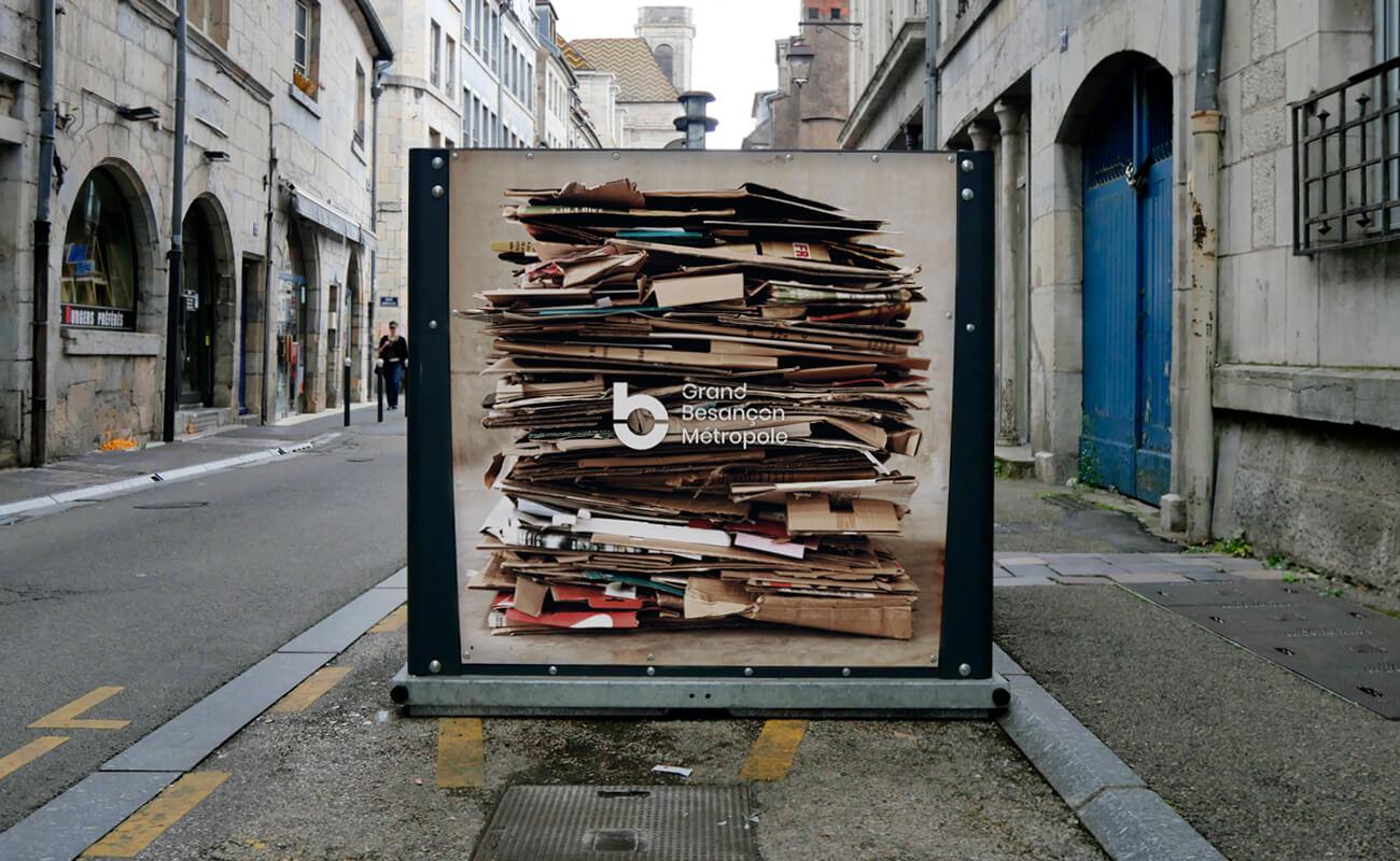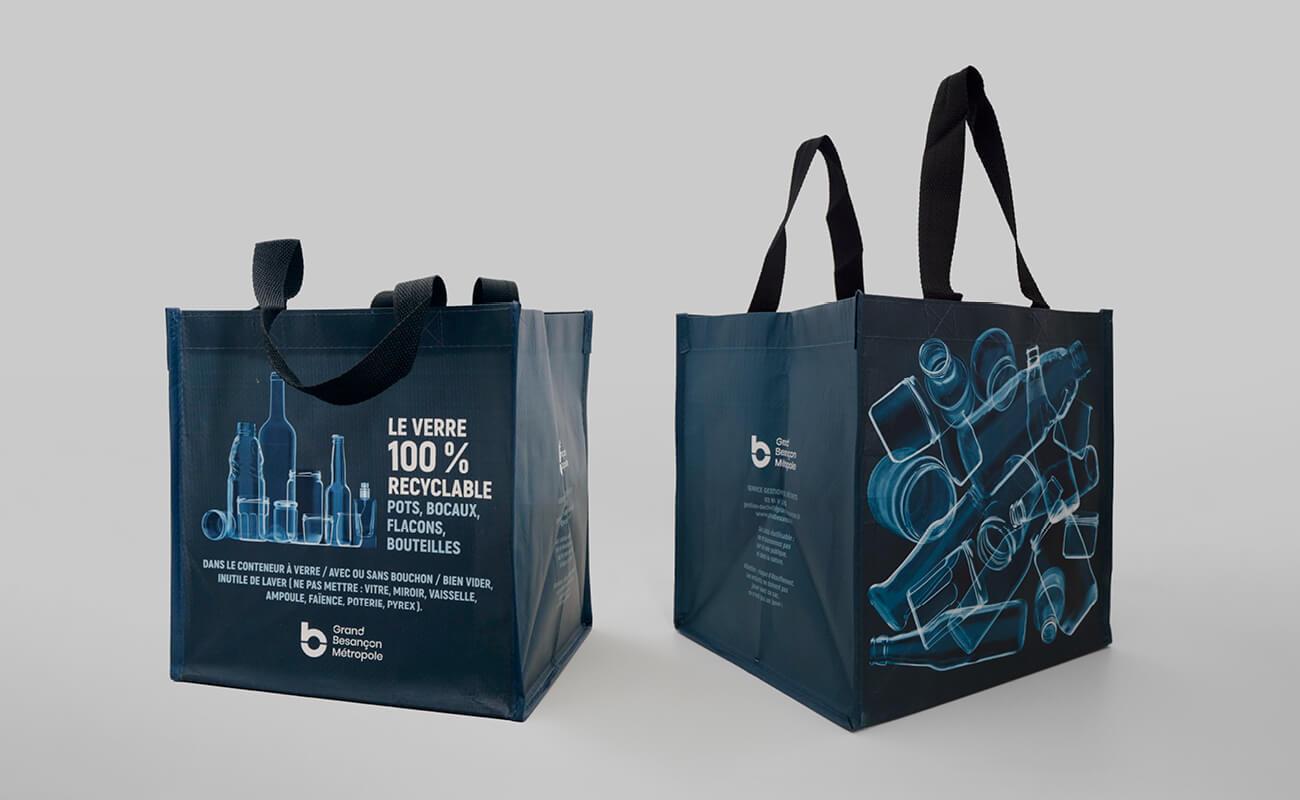 Habillage des conteneurs de recyclage pour Grand Besançon Métropole. Design du sac de recyclage de verre aux couleurs de l’habillage du conteneur correspondant. Bulma Studio.